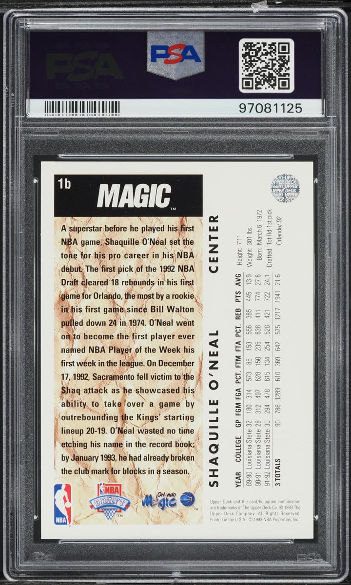 1992 Upper Deck Trade Card Shaquille O’Neal ROOKIE #1b PSA 9 MINT