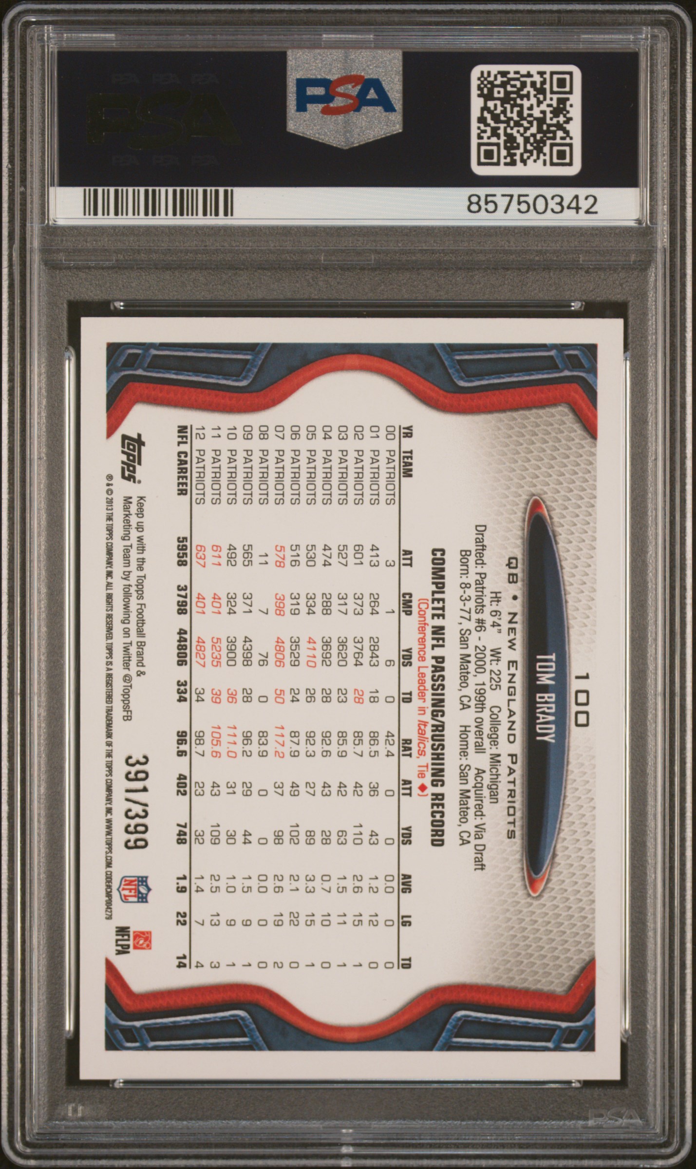 2013 Topps White Jersey Camo Tom Brady /399 #100 PSA 10 Gem Mint